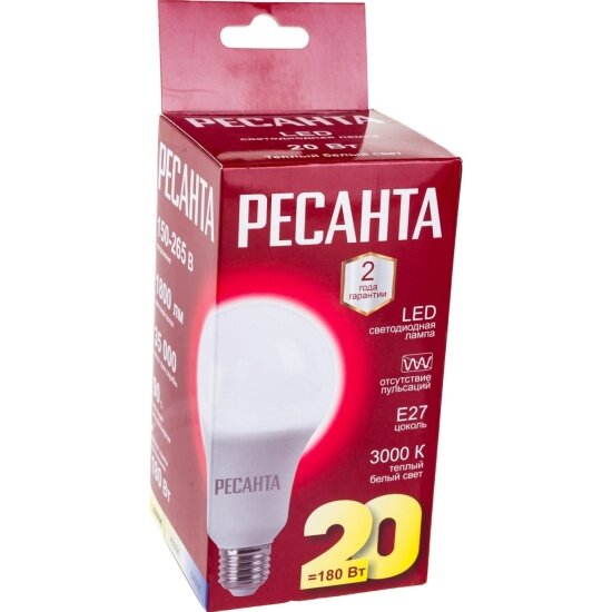 10 цен на Светодиодная лампа Ресанта LL-R-A80-20W-230-3K-E27 (груша, 20Вт, тепл, Е27), 76/1/21