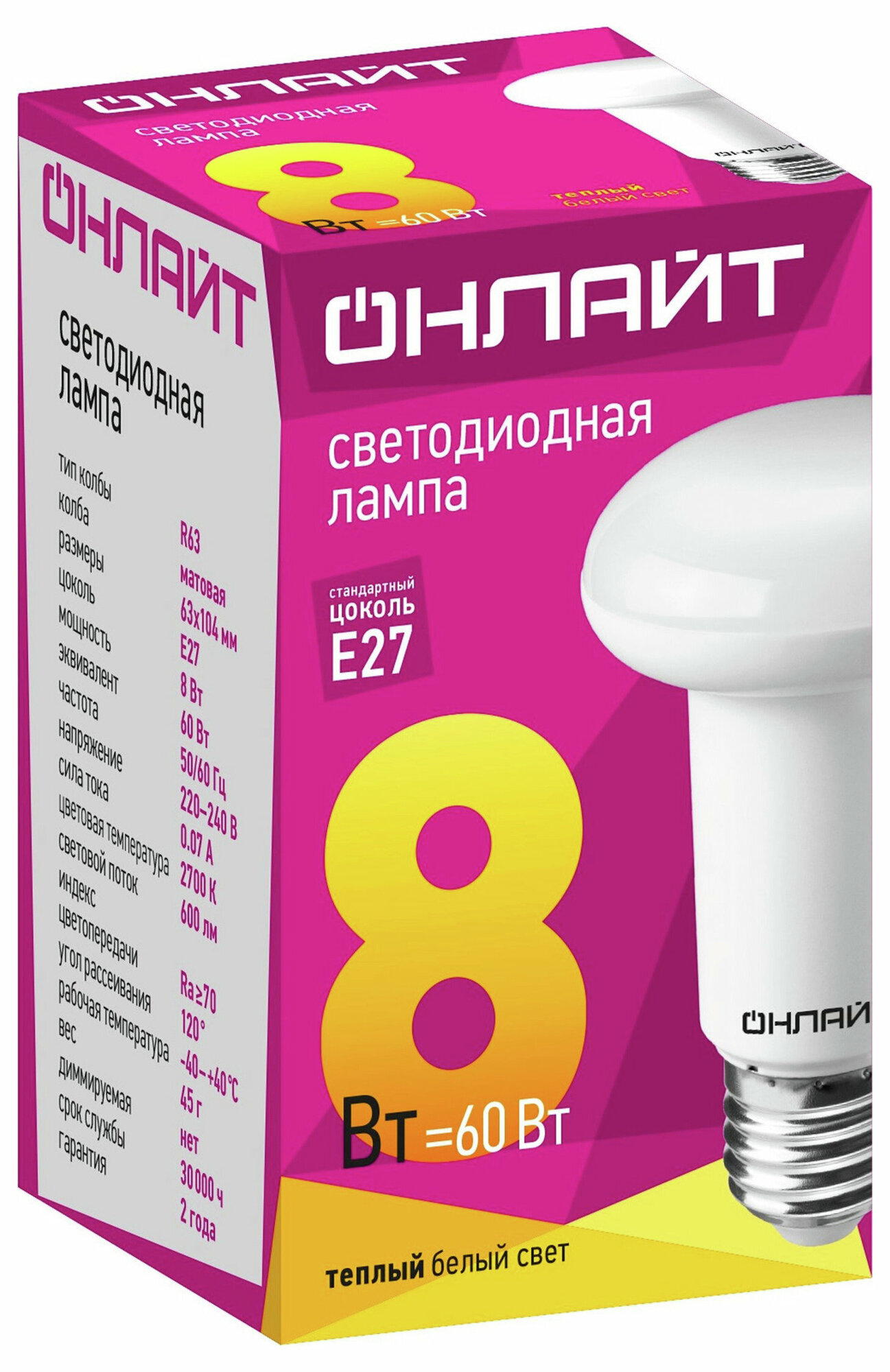 Лампа светодиодная E27, 8 Вт, 60 Вт, рефлектор, 2700 К, свет теплый белый, Онлайт