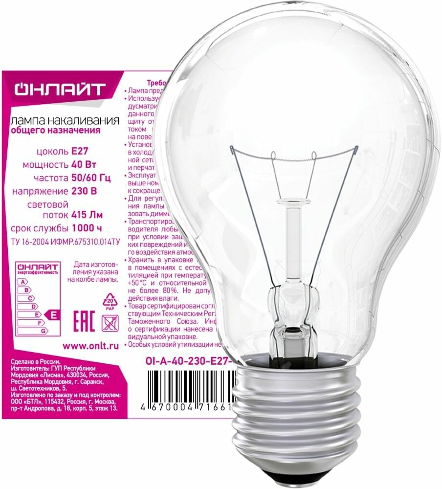 Лампа накаливания груша 40 Вт Онлайт 3000 К E27 информация: