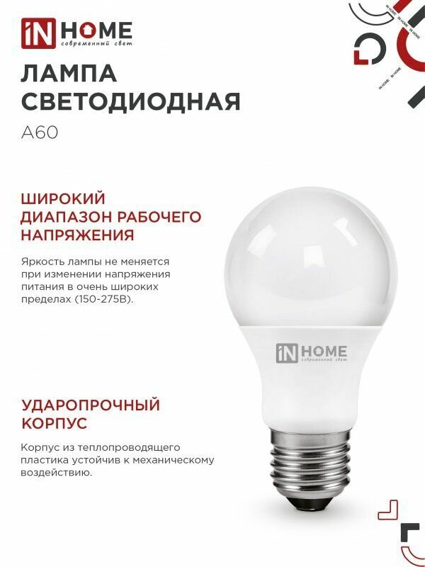 (10 шт.) Светодиодная лампочка IN HOME A60 10Вт 230В 6500К Е27 900Лм 880 ₽