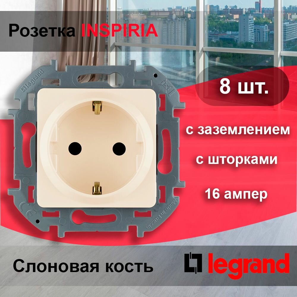 8 шт. Legrand INSPIRIA Слоновая кость Розетка 2К+З со шторками - немецкий стандарт - 16 А - 250 В, 673731 информация: