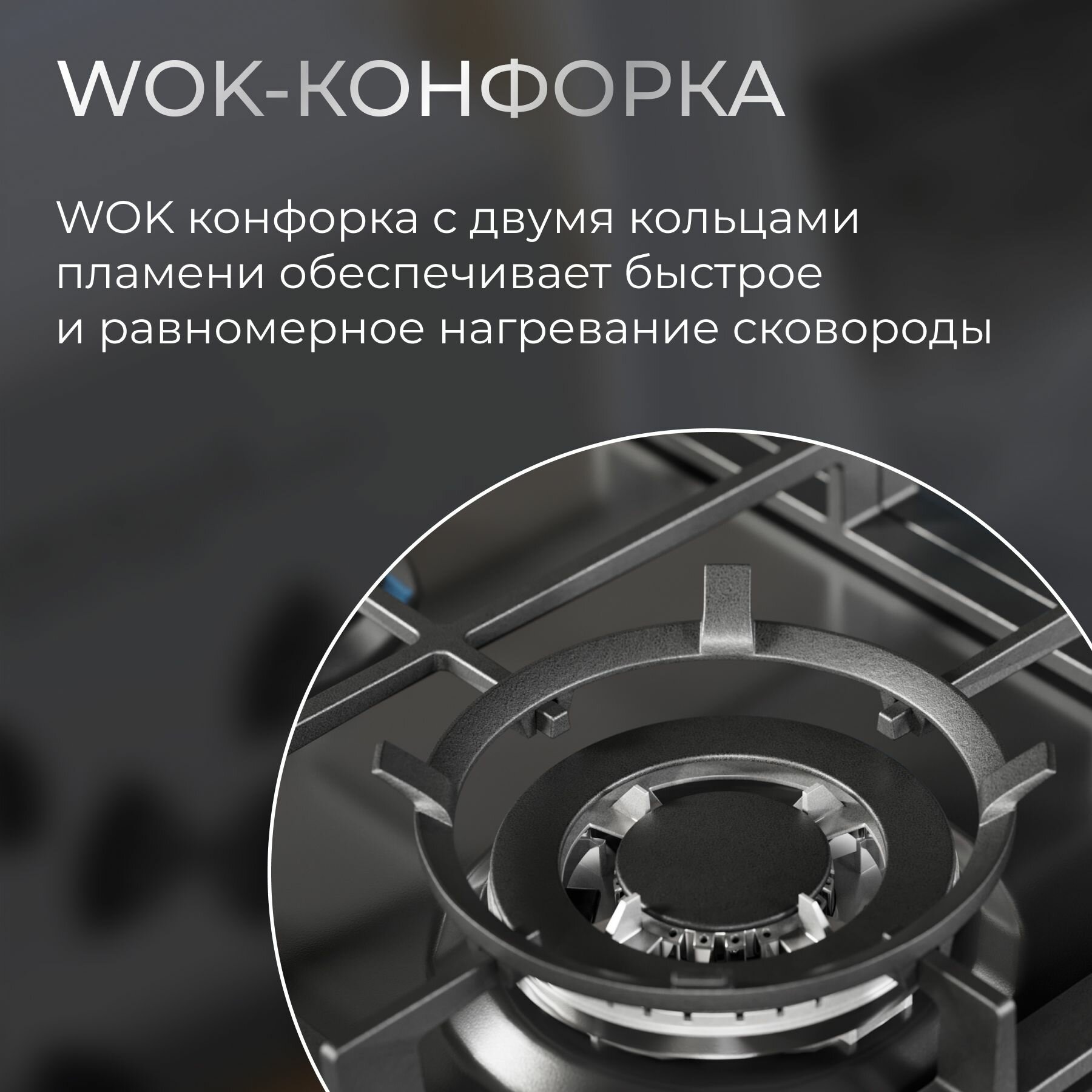 Газовая встраиваемая варочная панель 60 см KURO KHG 641 BL, газ-контроль, электроподжиг, WOK-конфорка, чугунные решетки, черный информация: