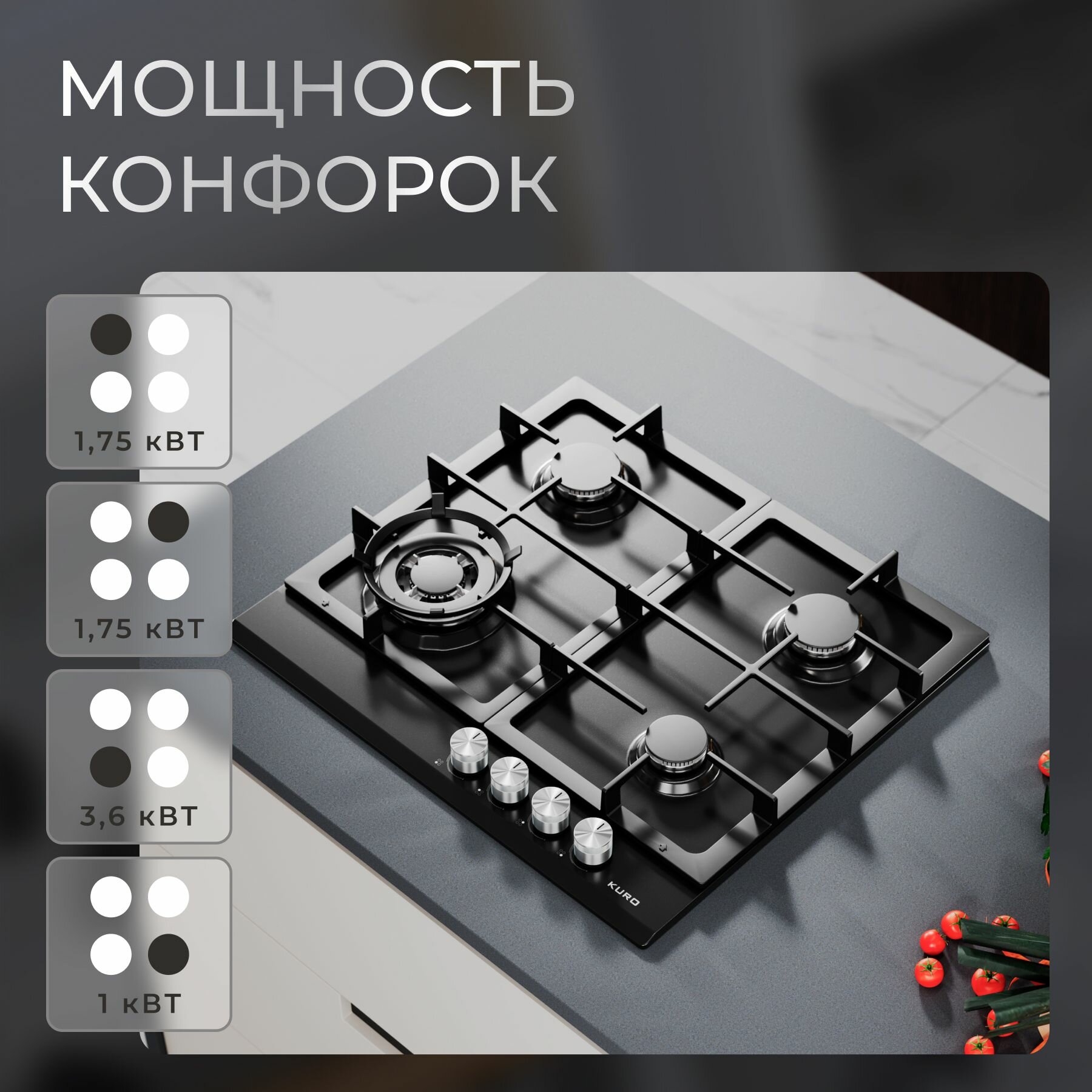10 цен на Газовая встраиваемая варочная панель 60 см KURO KHG 641 BL, газ-контроль, электроподжиг, WOK-конфорка, чугунные решетки, черный