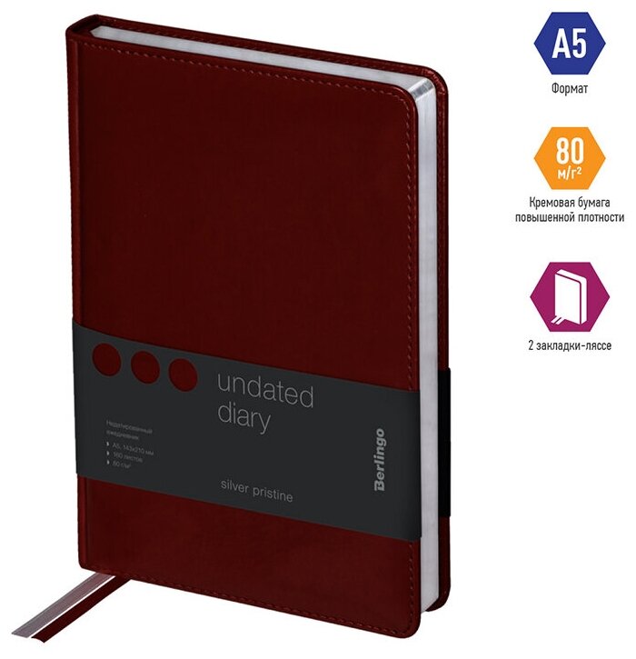 Ежедневник недатированный Berlingo A5, 160 листов, кожзам, "Silver Pristine", серебряный срез, красный (UD0_82502) 926 ₽