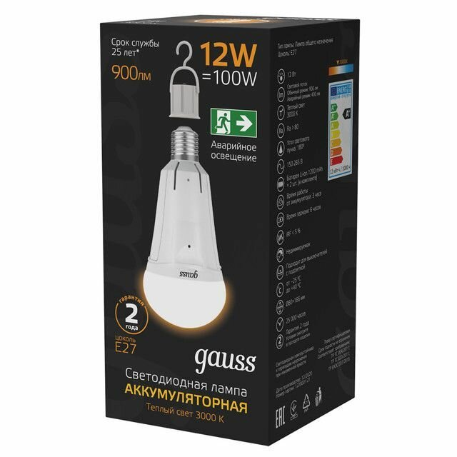 Лампа Gauss 12Вт Е27 900Лм LED 3000К авар. с Li-Ion аккумулятором груша информация: