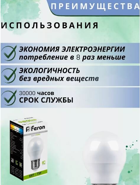 Лампа светодиодная FERON LB-95, G45, E27, 7 Вт, 230 В, 6400 К, 600 Лм, 220°, 82 х 45 мм