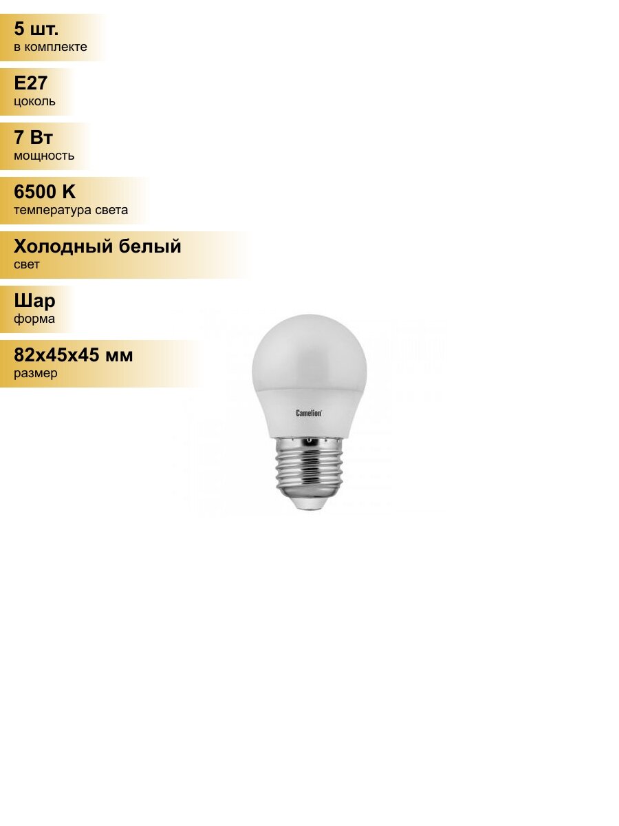(5 шт.) Светодиодная лампочка Camelion Шар G45 E27 7W(580lm 220°) 6500K 6K матов. 82x45 пластик LED7-G45/865/E27 Холодный белый. Цоколь E27 информация: