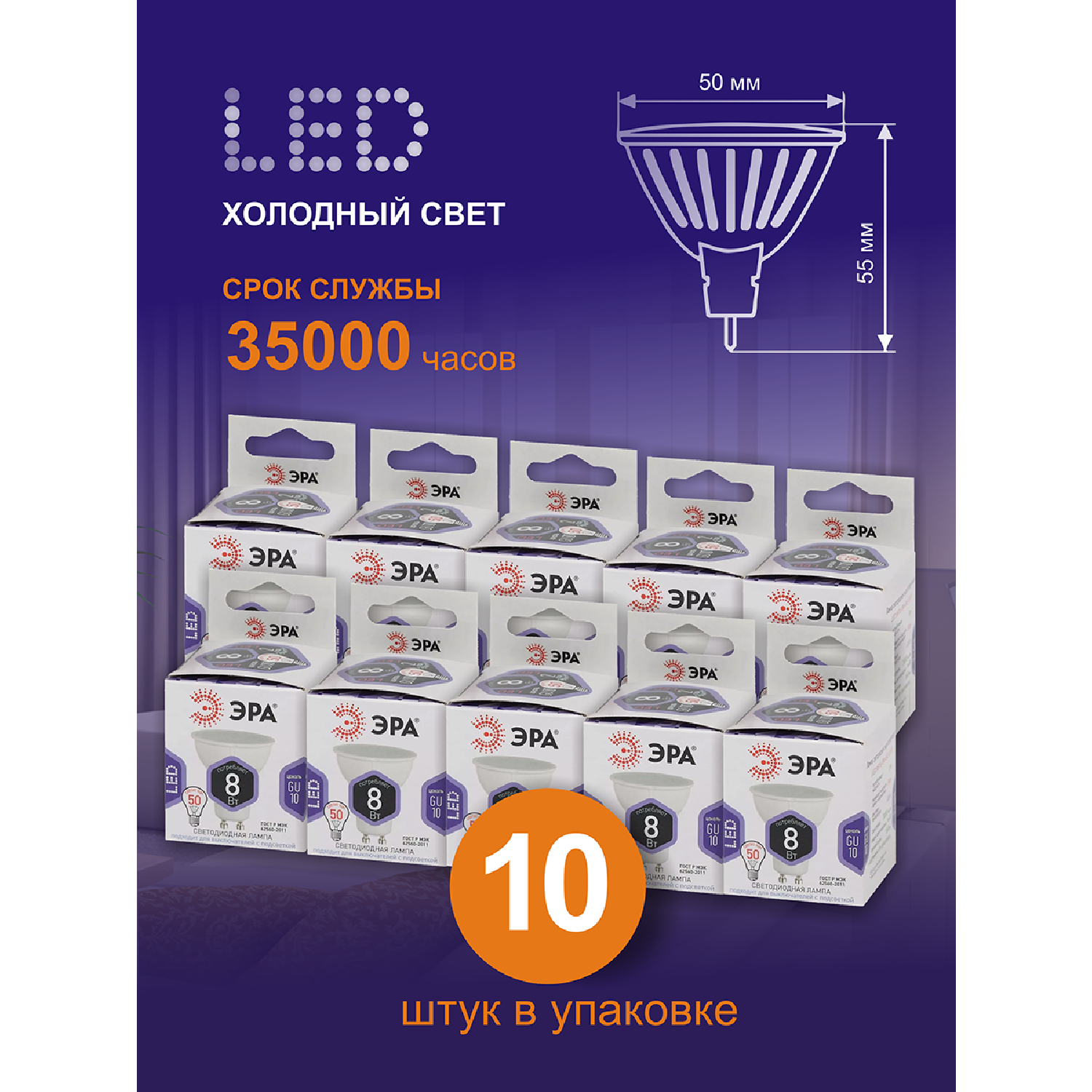 Лампочка светодиодная ЭРА (набор 10 штук) STD LED MR16-8W-860-GU10 GU10 8ВТ софит холодный дневной свет информация: