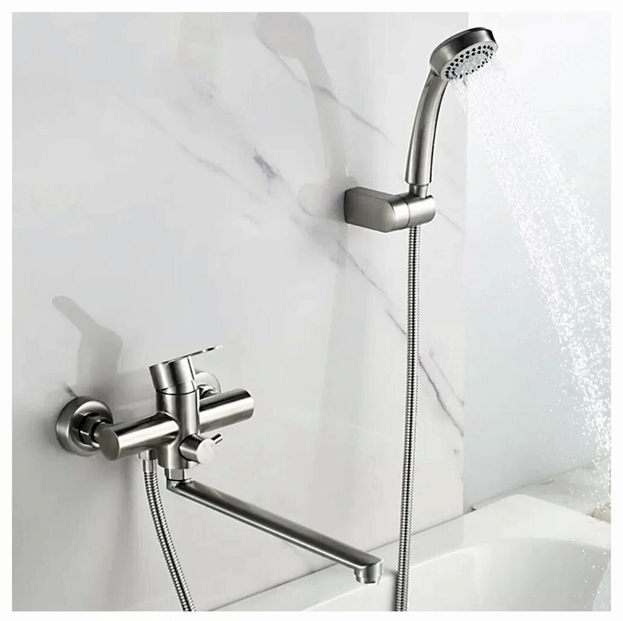 Однорычажный смеситель для ванны с душевой лейкой и длинным поворотным изливом 30 см Ledeme L72203 сатин, нержавеющая сталь