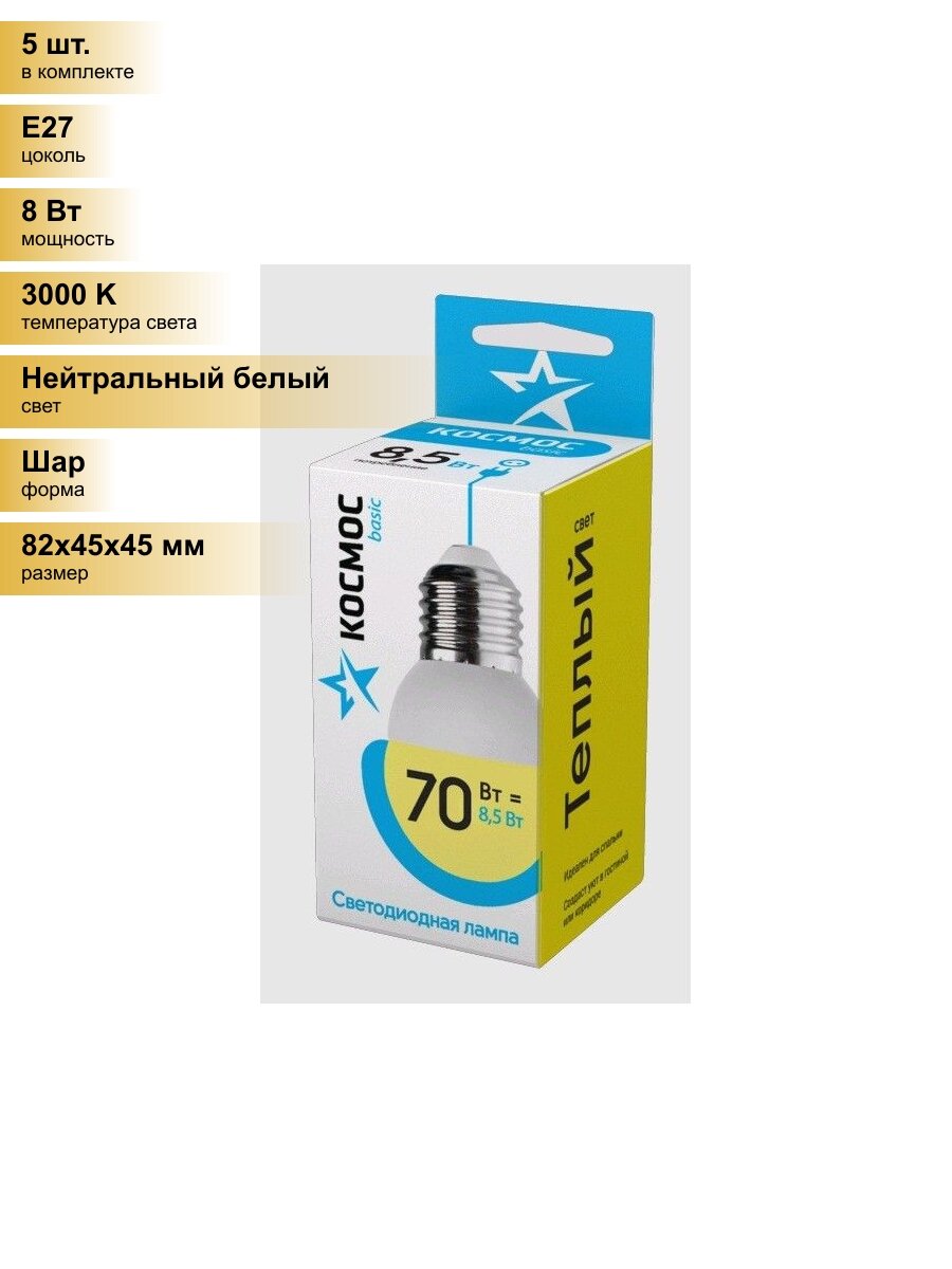(5 шт.) Светодиодная лампочка Космос шар E27 8,5W (8W) (720lm) 3000K 2K матов. 82x45 LkecLED8.5wGL45E2730 Нейтральный белый. Цоколь E27 информация: