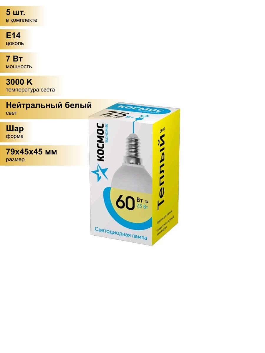 (5 шт.) Светодиодная лампочка Космос шар E14 7,5W (7W) (590lm) 3000K 2K матов. 79x45 LkecLED7.5wGL45E1430 Нейтральный белый. Цоколь E14 информация:
