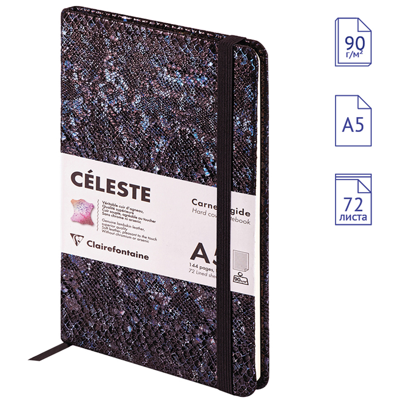 Записная книжка A5, 72 л, Clairefontaine "Celestial leather. Lazer Black", 90 г/м2, резинка, кожа информация: