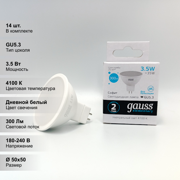 (14 шт.) Светодиодная лампочка Gauss MR16, мощность 3.5Вт, напряжение питания 220В, цветовая температура 4100K, нейтральный белый свет, цоколь GU5.3, размер 50х50 мм информация: