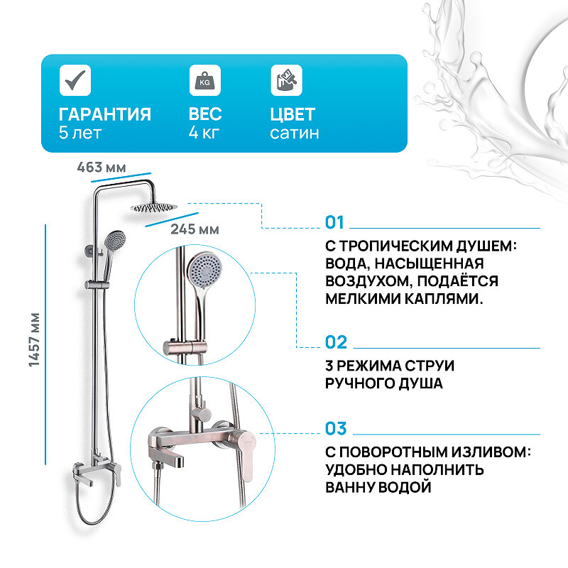 | Дополнительная информация | высота стойки для душа: 1457 мм; диаметр верхнего душа: 245 мм |