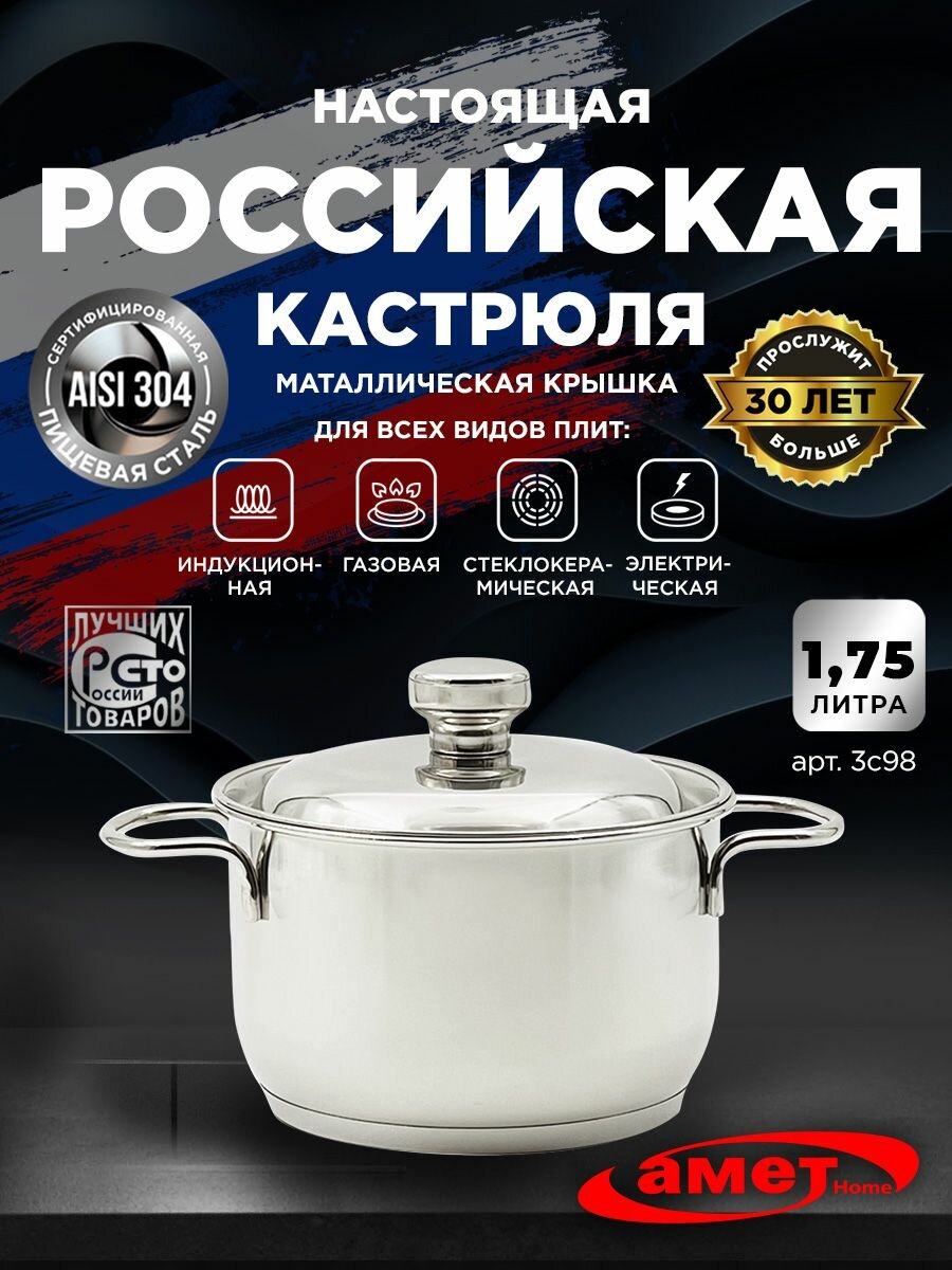 Амет 1с532 Классика-Прима ТРС-3, Кастрюля из нержавеющей стали 1,75л (d160 мм, металлическая крышка, прутковые ручки)