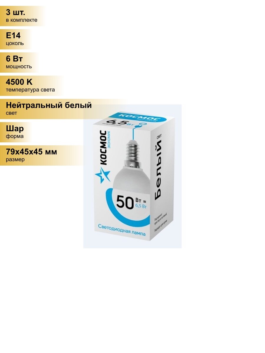 (3 шт.) Светодиодная лампочка Космос шар E14 6,5W (6W) (480lm) 4500K 4K матов. 79x45 LkecLED6.5wGL45E1445 Нейтральный белый. Цоколь E14 информация: