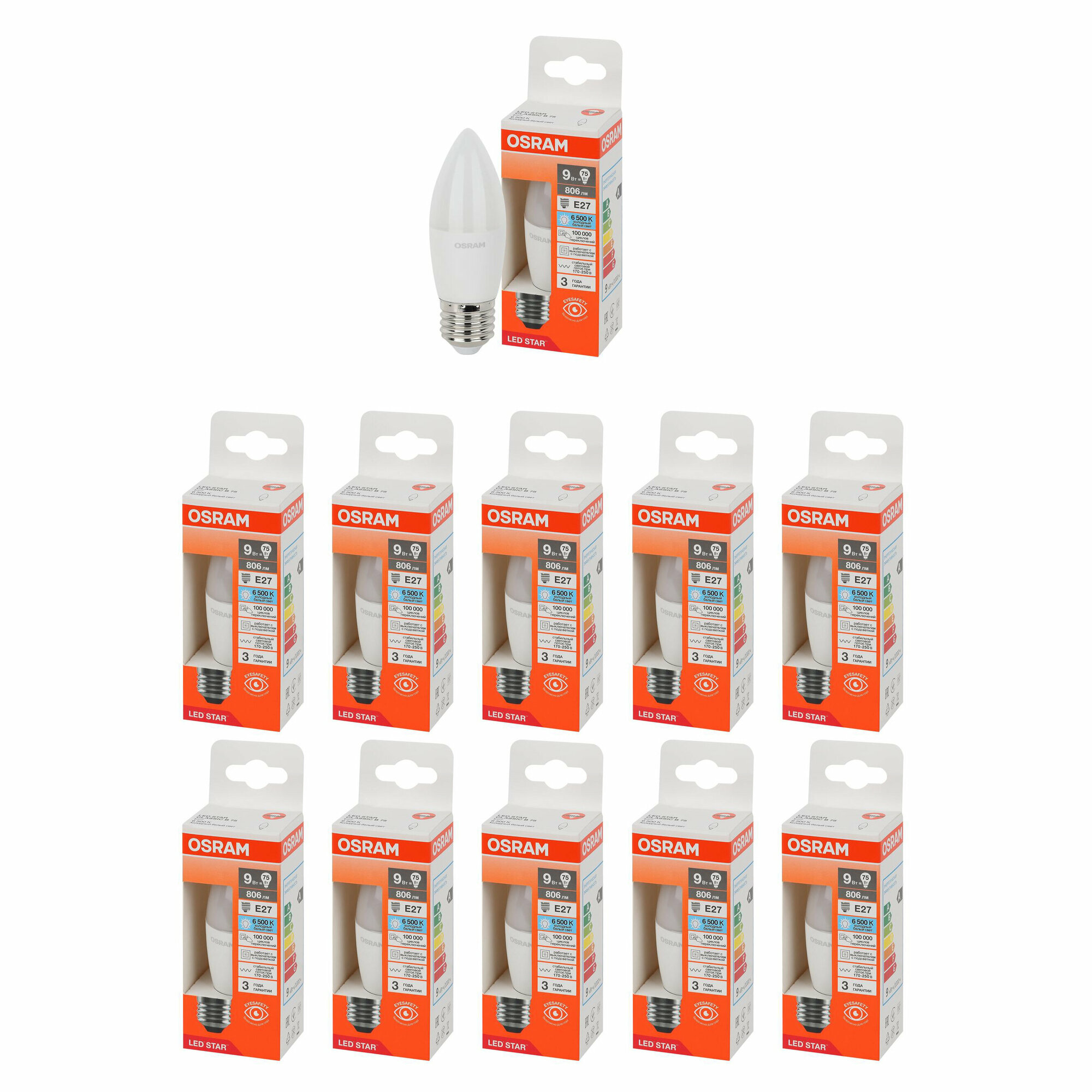 10 цен на 10шт/уп. Лампа LED Свечка 9Вт 170-250V E27 806Лм 6500К Угол 200 град. D-37mm L-110mm Свет Холодный белый OSRAM, уп. 10шт