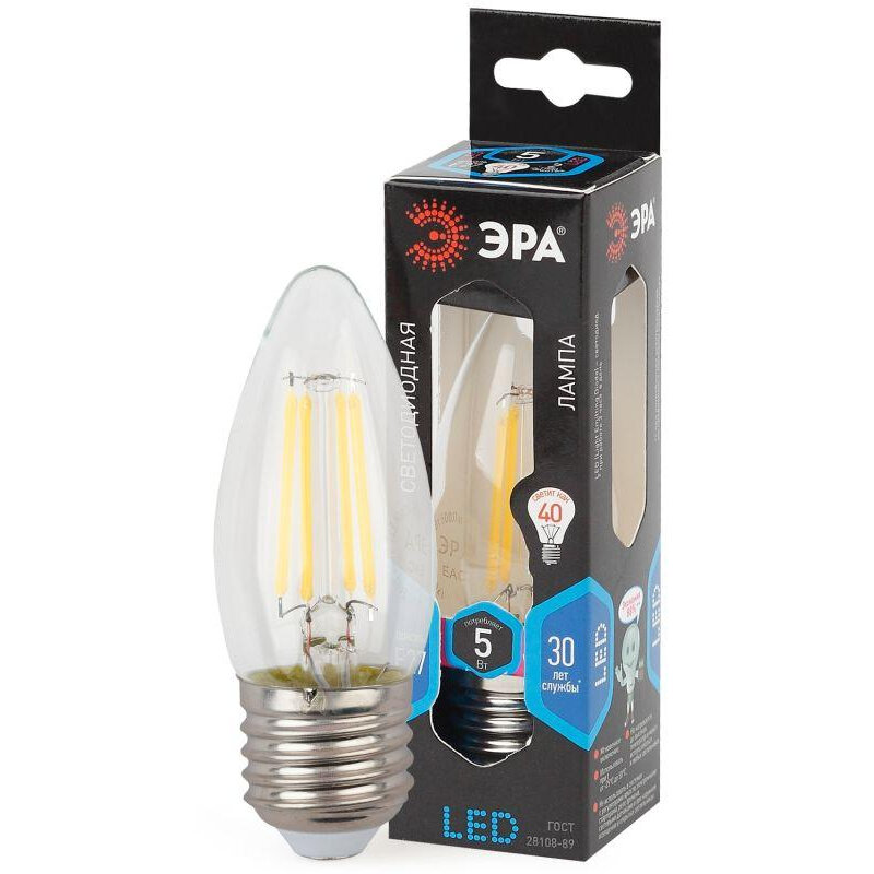 Типы/Лампочки/Филаментные ЭРА Лампа светодиодная филаментная ЭРА E27 5W 4000K прозрачная F-LED B35-5W-840-E27 Б0027934