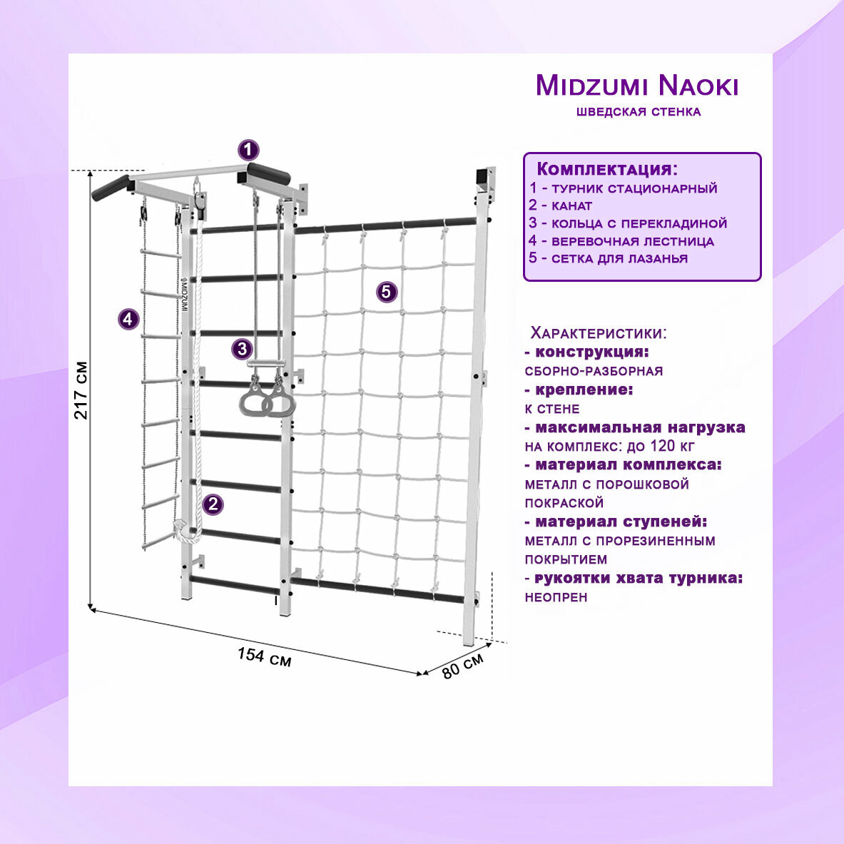 Шведская стенка Midzumi "Naoki", турник, неопреновая обивка, максимальная нагрузка 120кг информация: