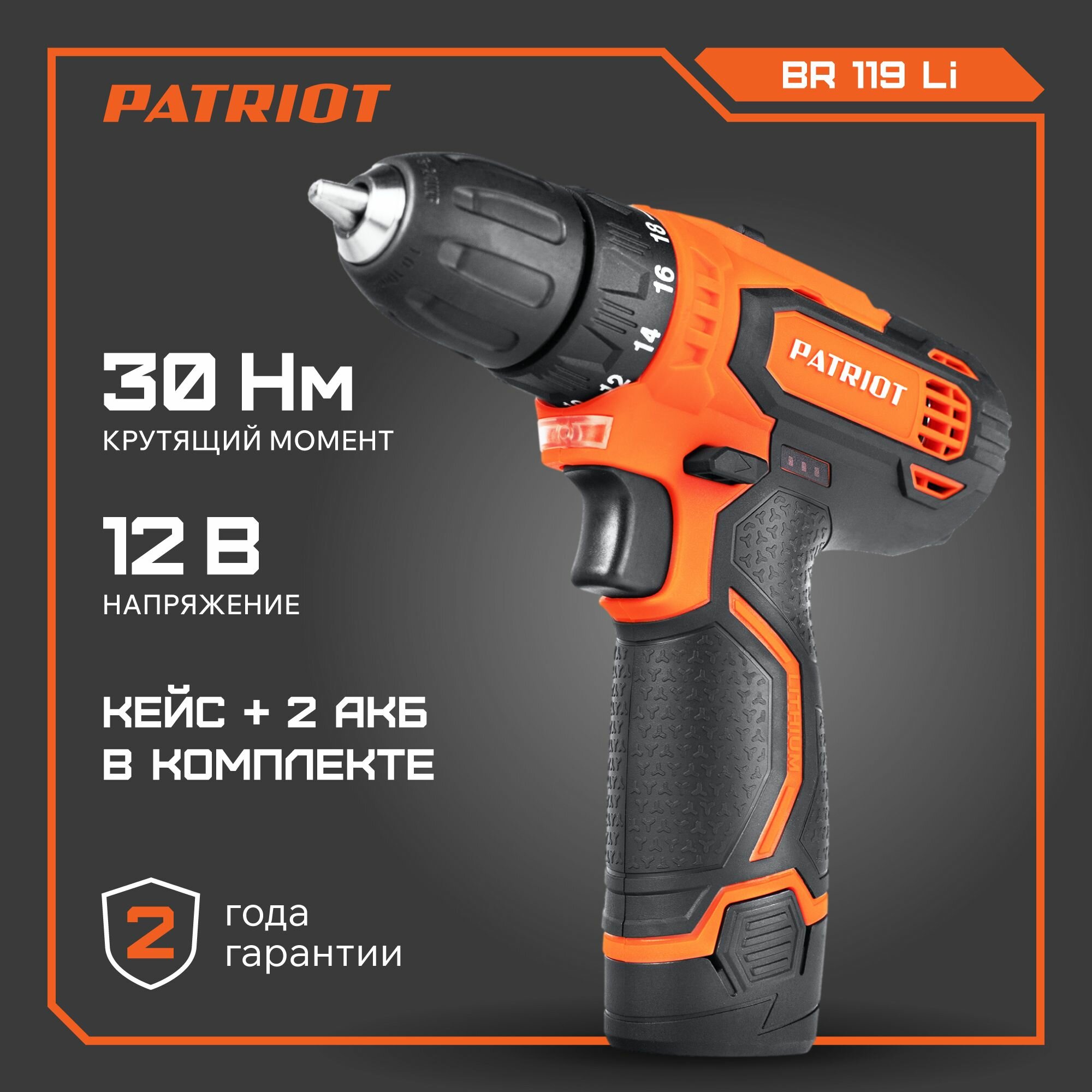 Дрель-шуруповерт аккумуляторная BR 119Li 2 АКБ Li-Ion 12В 2А.ч 2 скорости PATRIOT 180301119