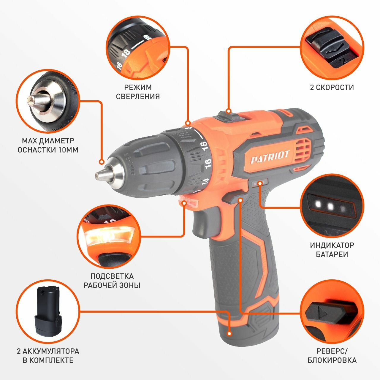 10 цен на Дрель шуруповерт аккумуляторная PATRIOT BR 119Li, 12В 2,0Ач, 25Нм, 2 батареи в комплекте