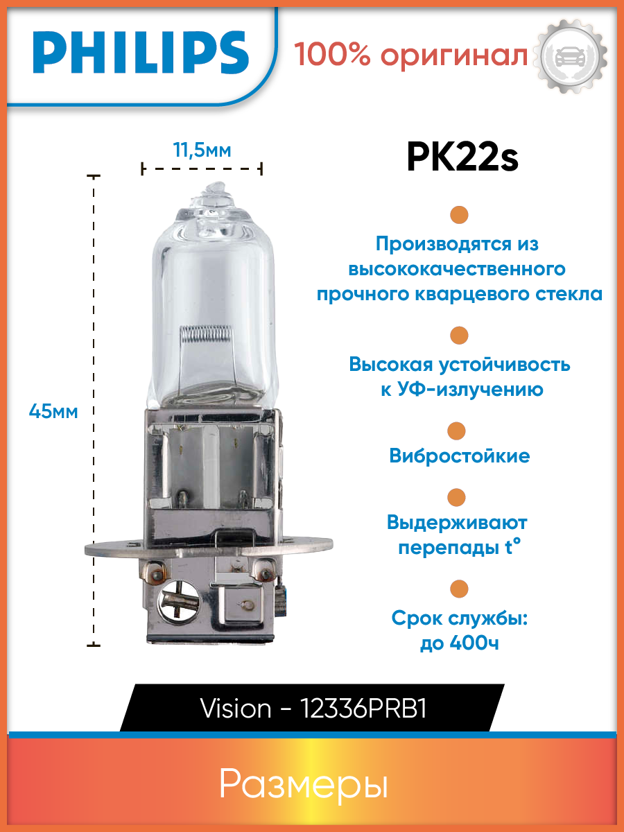 Лампа автомобильная галогенная Philips Vision (+30% света), 12336PRB1, H3, 12V, 55W, PK22s, 3000K, 1500lm (блистер)(1 шт.)