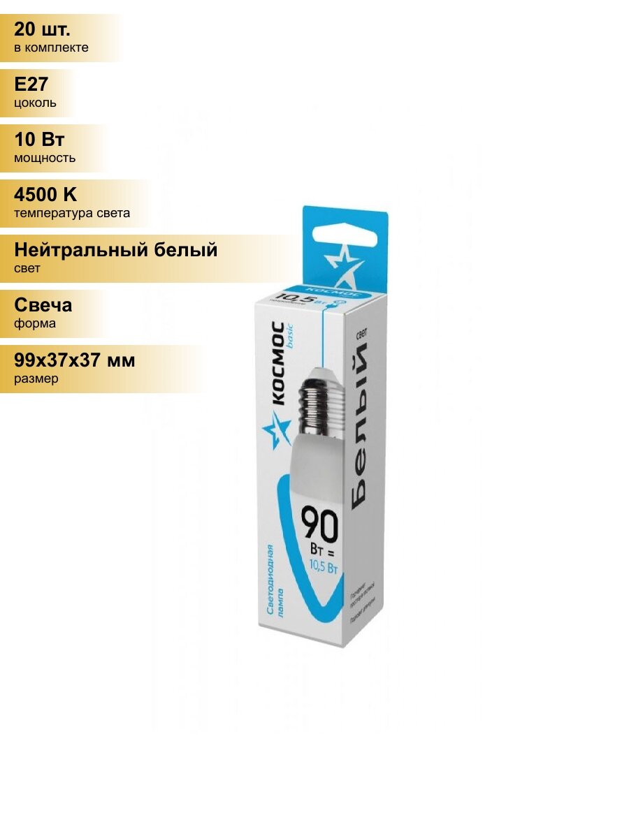 Отзывы на (20 шт.) Светодиодная лампочка Космос свеча E27 10,5W (10W) (860lm) 4500K 4K матов. 99x37 LkecLED10.5wCNE2745 Нейтральный белый. Цоколь E27