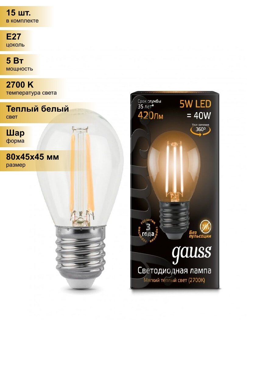 (15 шт.) Светодиодная лампочка Gauss Filament Шар G45 E27 5W(420lm) 2700K 2K 80x45 филамент (нитевидная), прозр. 105802105 Теплый белый. Цоколь E27 информация:
