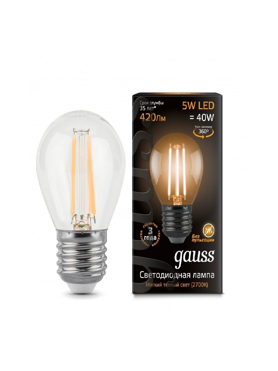 Отзывы на (2 шт.) Светодиодная лампочка Gauss Filament Шар G45 E27 5W(420lm) 2700K 2K 80x45 филамент (нитевидная), прозр. 105802105 Теплый белый. Цоколь E27