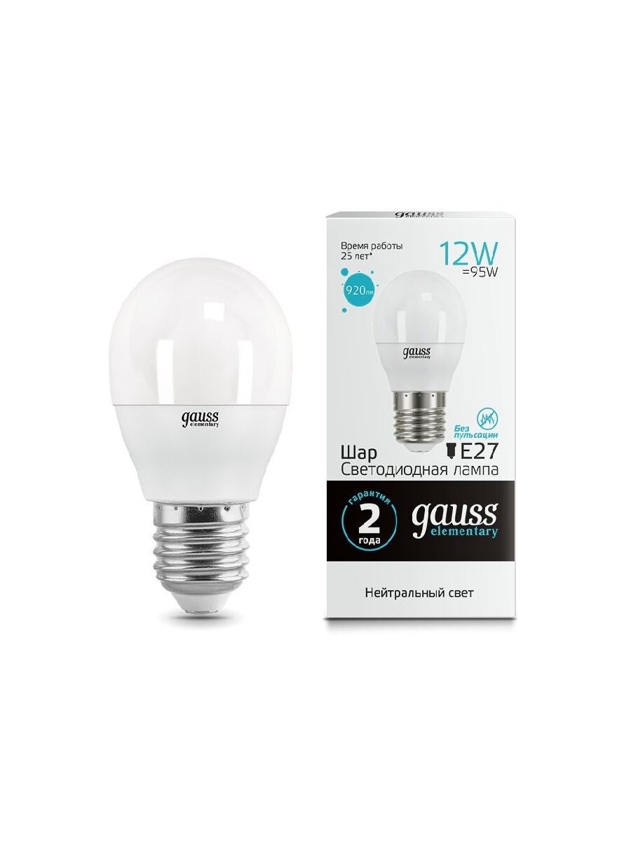(12 шт.) Светодиодная лампочка Gauss Elementary Шар G45 E27 12W 920lm 4100K 4K 86х45 матовая, пластик/алюм. 53222 Нейтральный белый. Цоколь E27 информация: