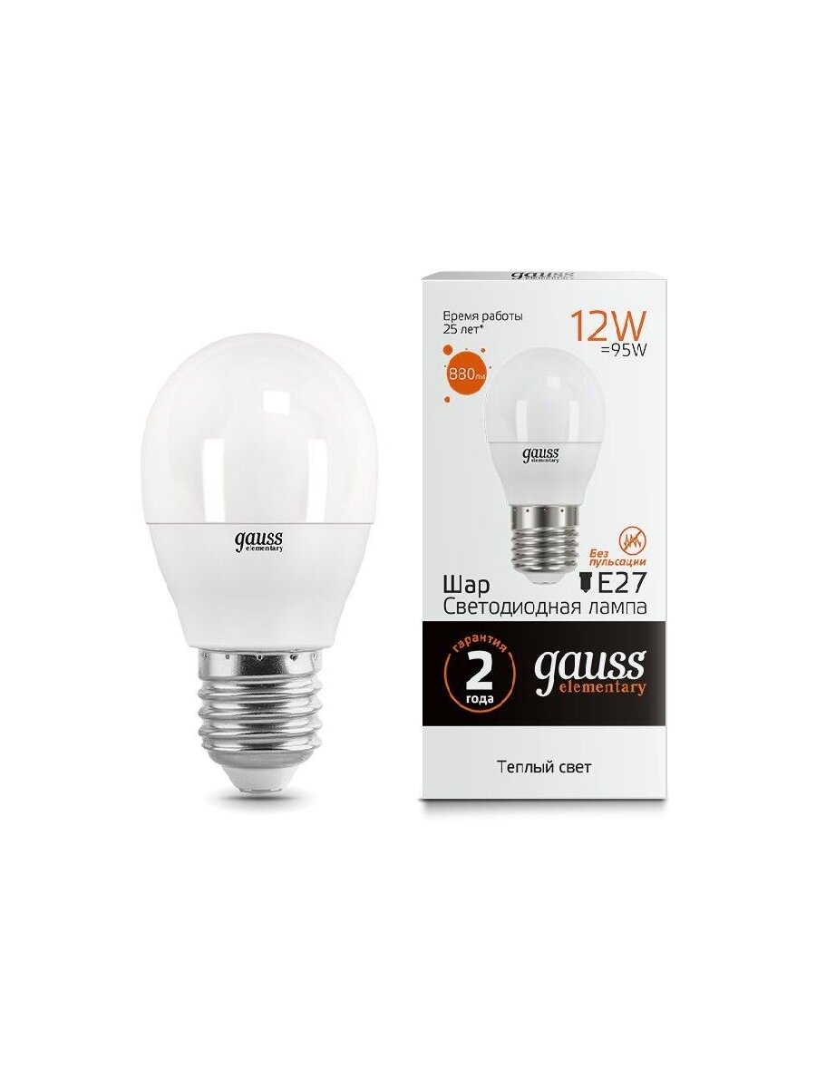 Отзывы на (5 шт.) Светодиодная лампочка Gauss Elementary Шар G45 E27 12W 880lm 3000K 2K 86х45 матовая, пластик/алюм. 53212 Нейтральный белый. Цоколь E27