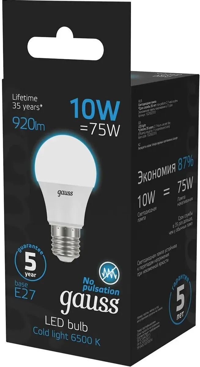 Отзывы на Лампочка светодиодная Gauss 102502310 10Вт цок: E27 груша 220B 6500K св. свеч. бел. хол. (упак:10шт)