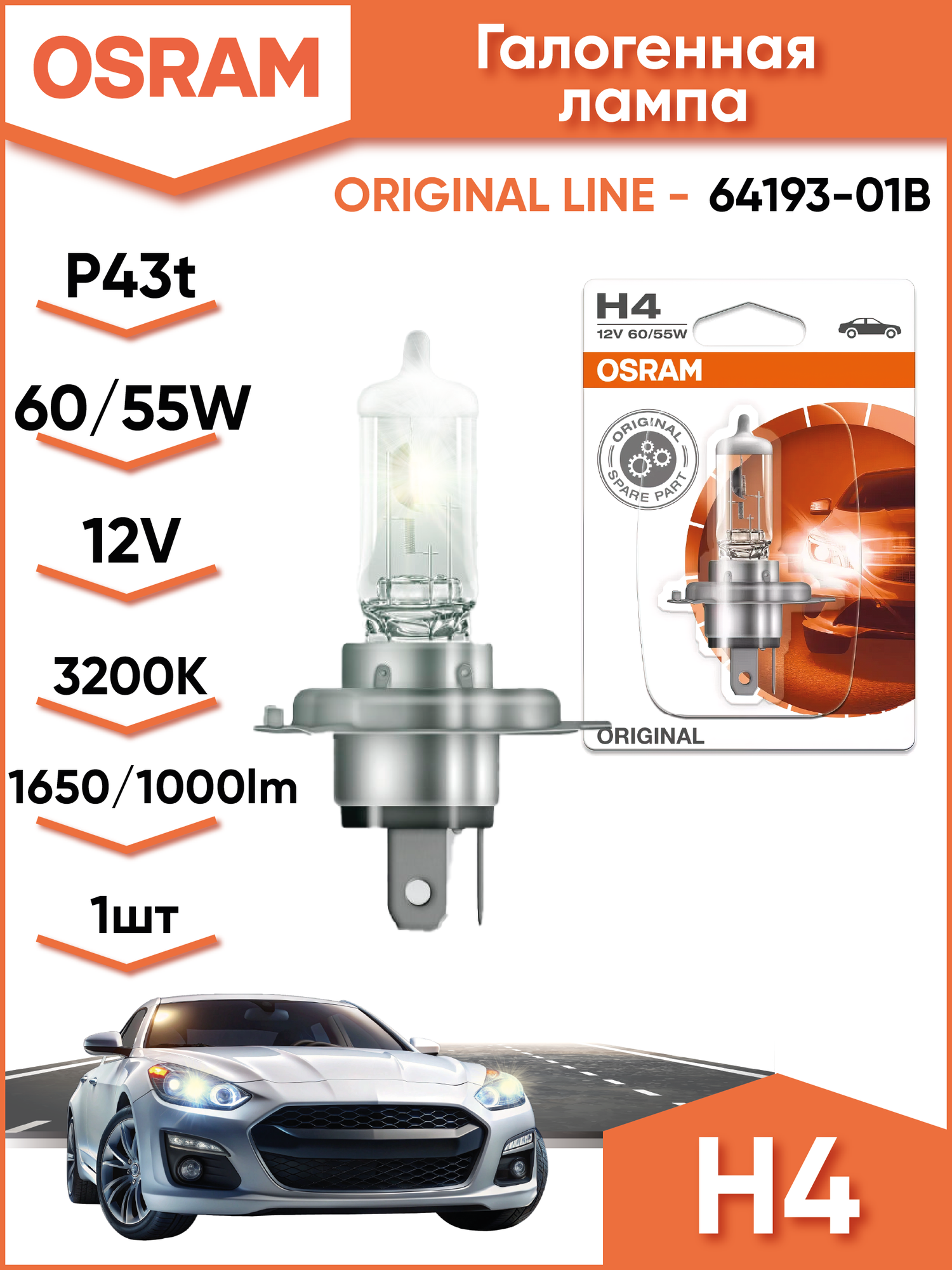 Лампа Г/С H4 (60/55W) P43t-38 Original Блистер 12V 64193-01B 4050300925127 Osram арт. 64193-01B