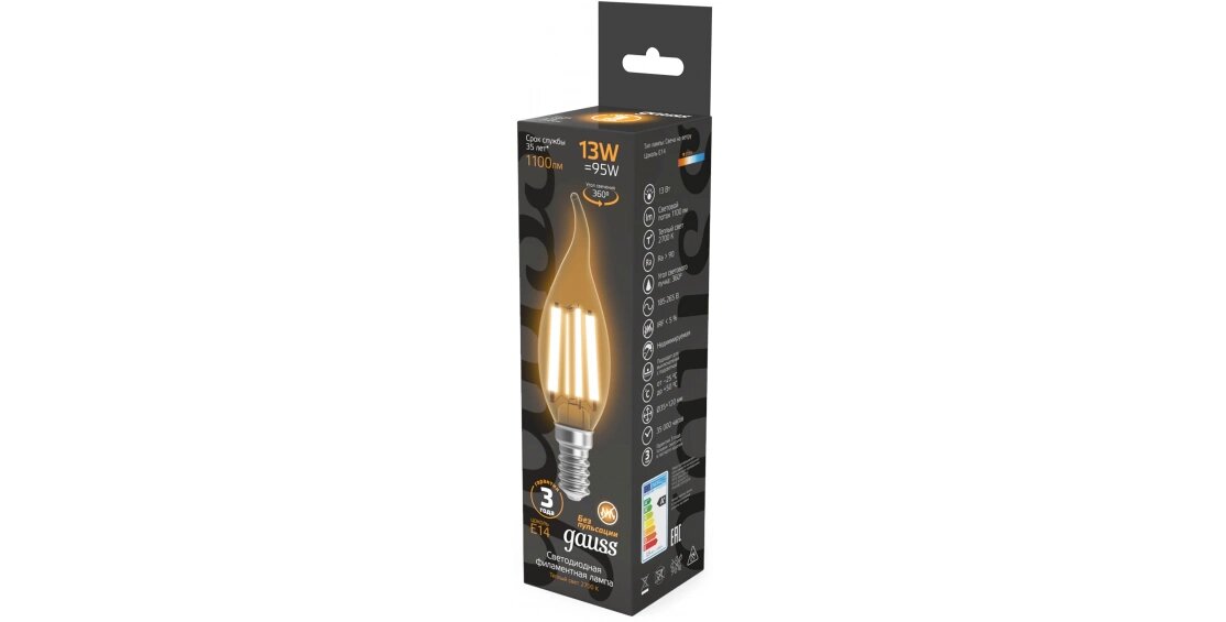 Лампа филаментная Gauss Filament, 13Вт, цоколь E14, белый теплый, 2700К (10шт) (104801113) информация:
