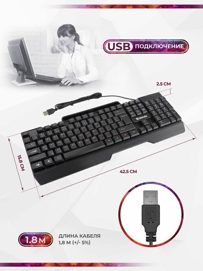 Клавиатура проводная Defender, Search, HB-790, мембранная, USB, цвет: чёрный, (арт.45790) US информация: