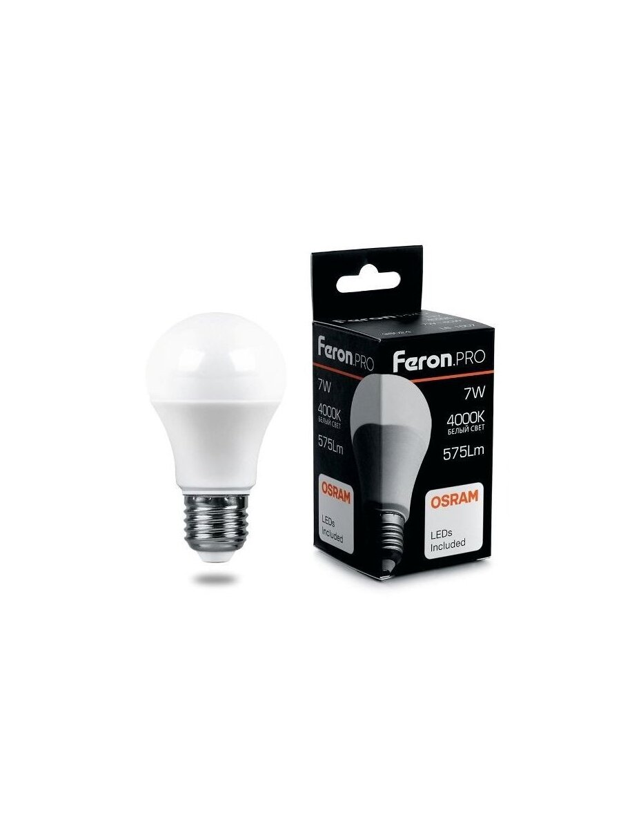 Отзывы на (3 шт.) Светодиодная лампочка Feron.PRO ЛОН A60 E27 7W(575lm) 4000K 4K матовый 100x55 OSRAM LED LB-1007 38024 Нейтральный белый. Цоколь E27
