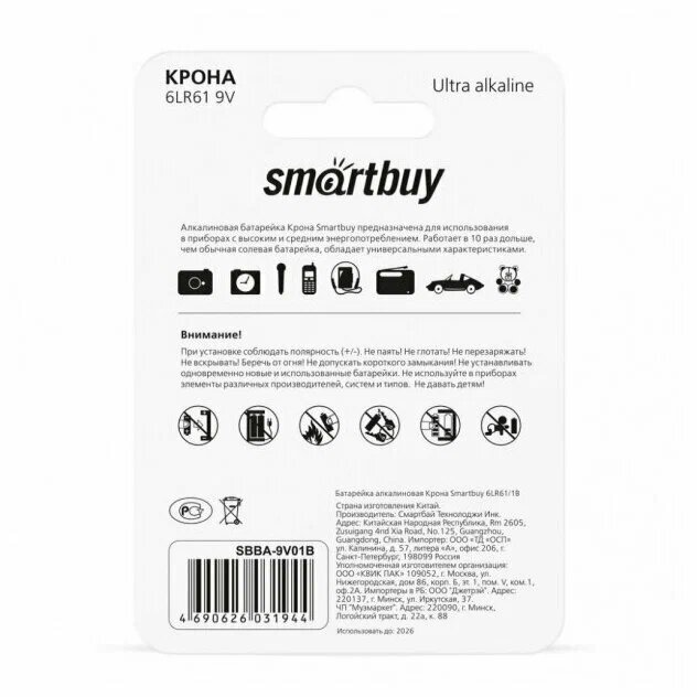 Элемент питания SMARTBUY Ultra Alkaline 6LR61 9V бл 1 110 ₽