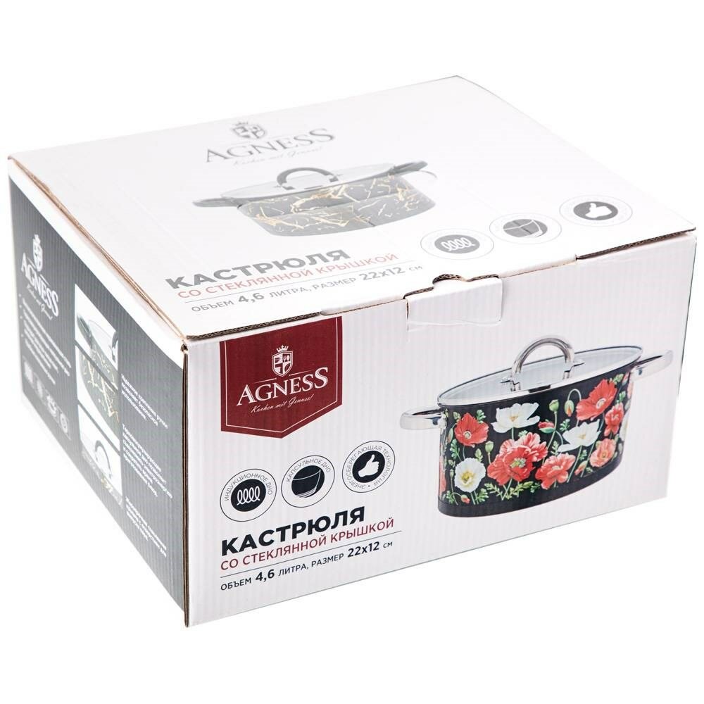 Кастрюля agness "Феерия" стеклянная крышка, индукция, нерж. сталь, 4,6 л 22х12 см информация: