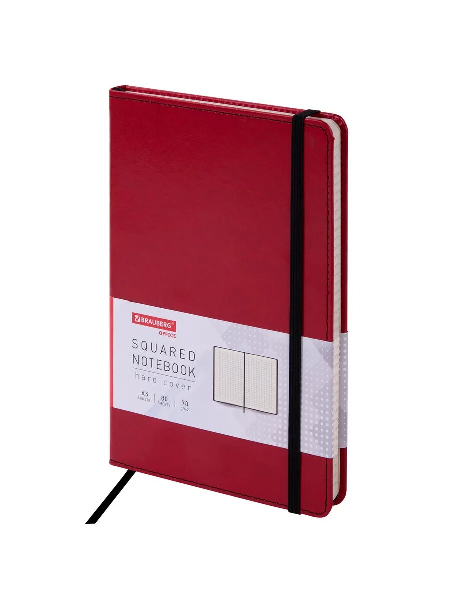 Блокнот А5 (148x218 мм), BRAUBERG "Office", под кожу, 80 л., резинка, клетка, красный, 111030 Комплект : 1 шт .