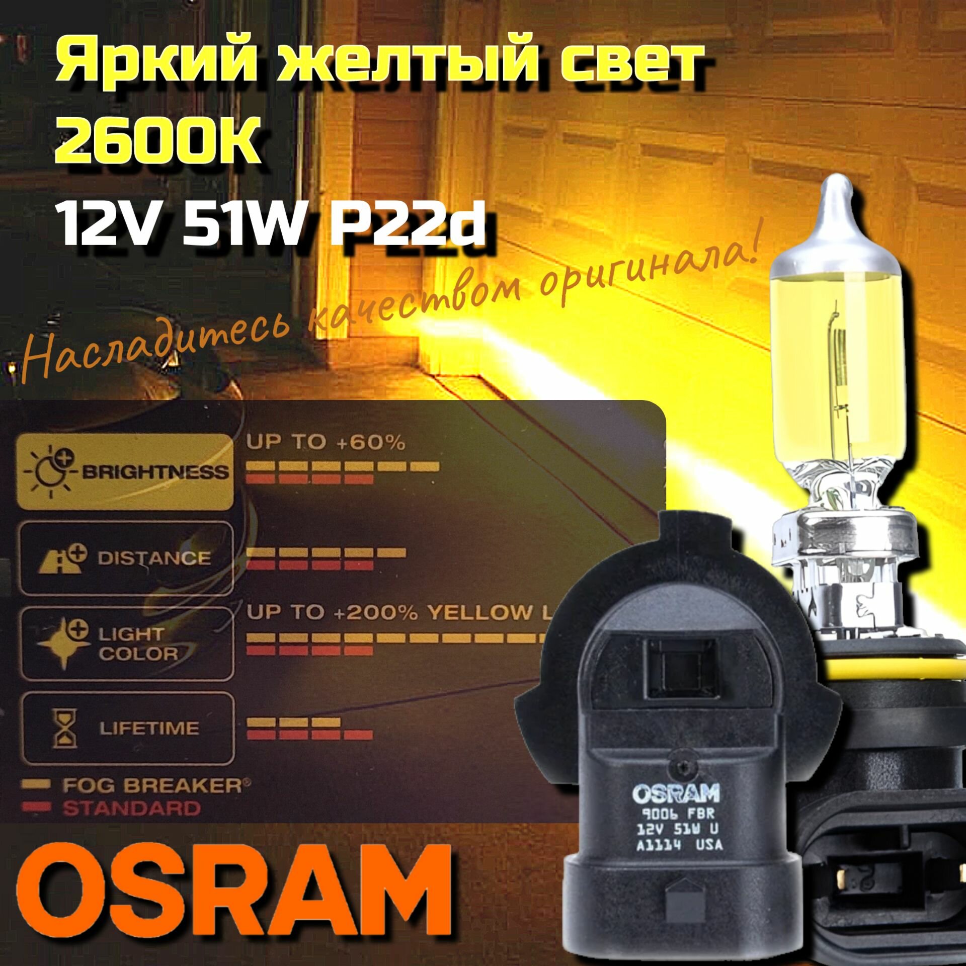 Отзывы на Галогенные лампы OSRAM FOG BREAKER HB4 9006 FBR P22d Фара, 12V 51W 2600К противотуманные фары, + 200% желтый свет + 60% яркие автомобильные галогенные лампы (2 шт.)