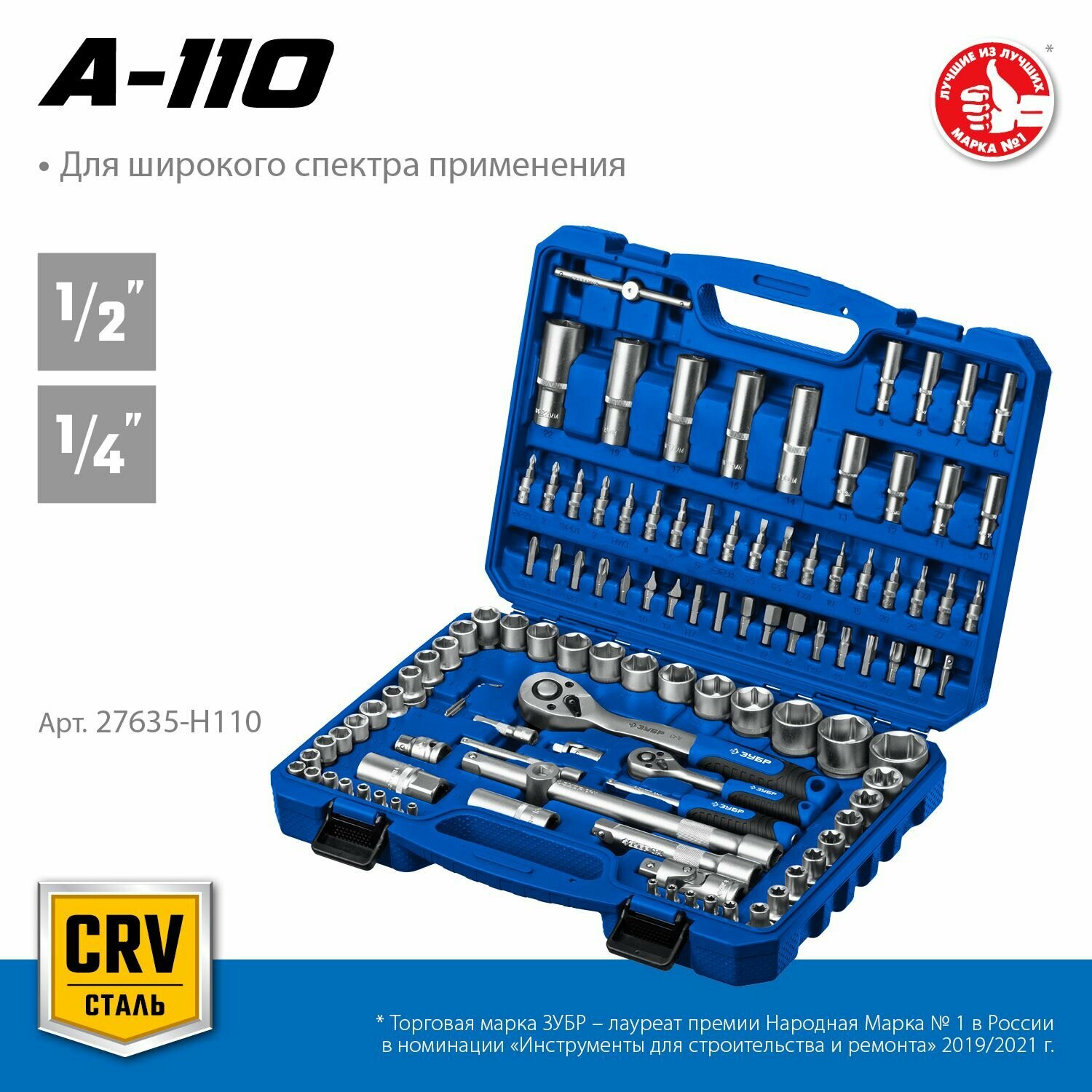 ЗУБР А-110, 110 предм, (1/2 + 1/4 ), универсальный набор инструмента, Профессионал (27635-H110) информация: