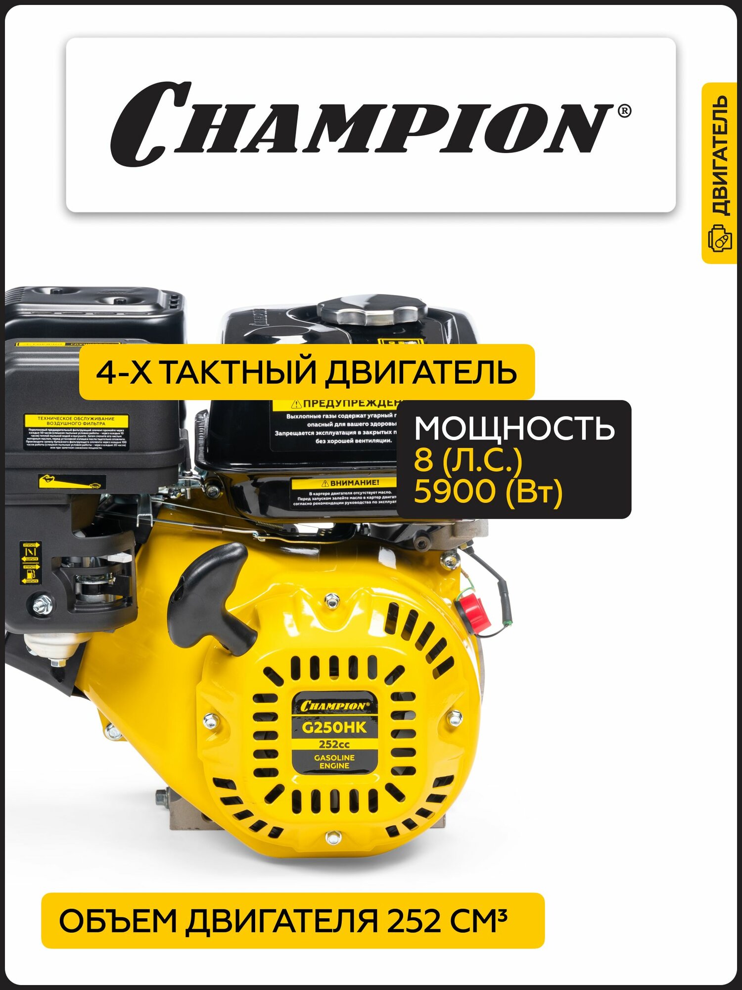 Двигатель бензиновый четырехтактный CHAMPION G250HK, 5,9 кВт, 252 см3, ручной запуск информация: