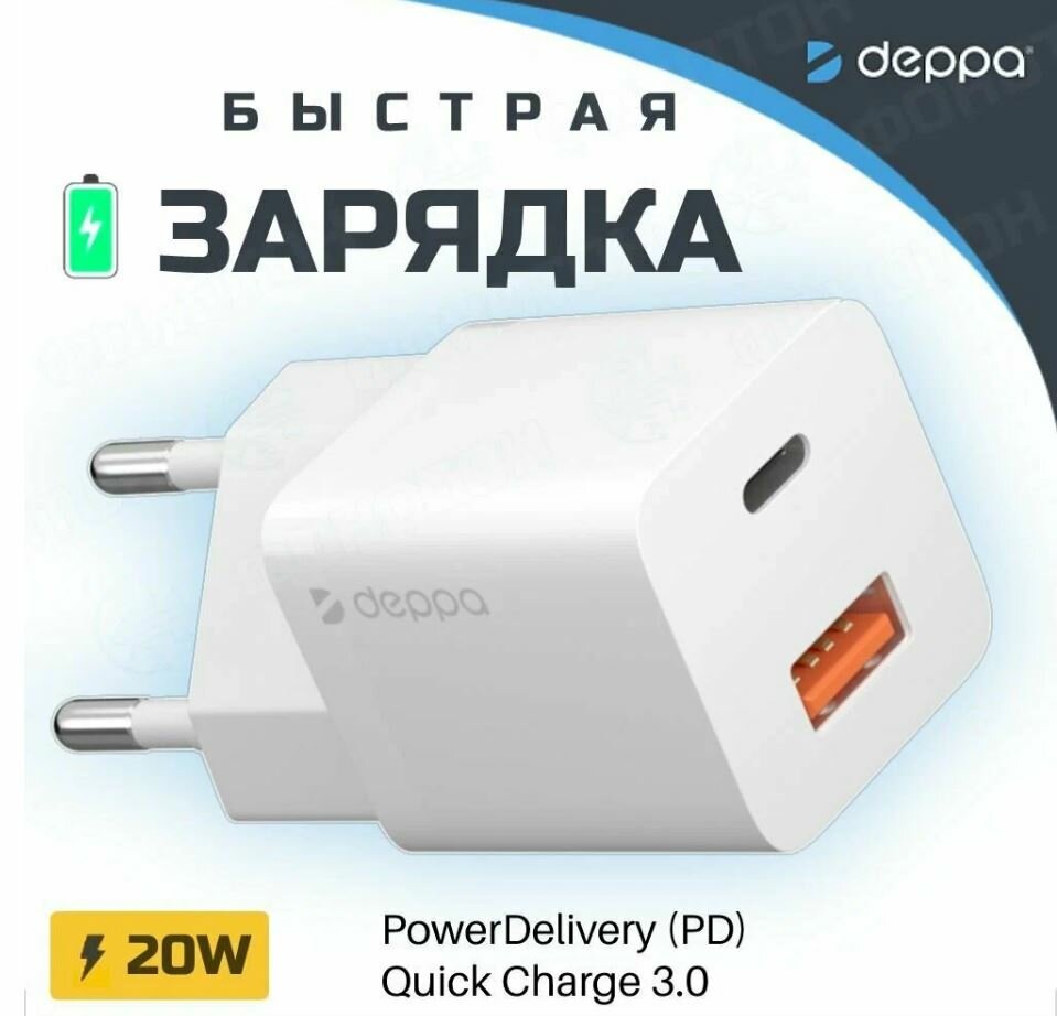 Зарядное устройство сетевое Deppa USB-C+USB-A, PD 3.0, QC 3.0, 20Вт, белый 3 486 ₽
