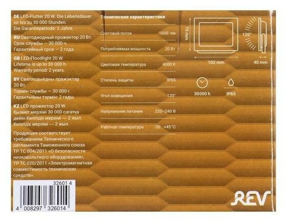 Прожектор светодиодный REV ДО-20 20 Вт 220 В IP65 90х65х20 мм 4000К (32601 4)