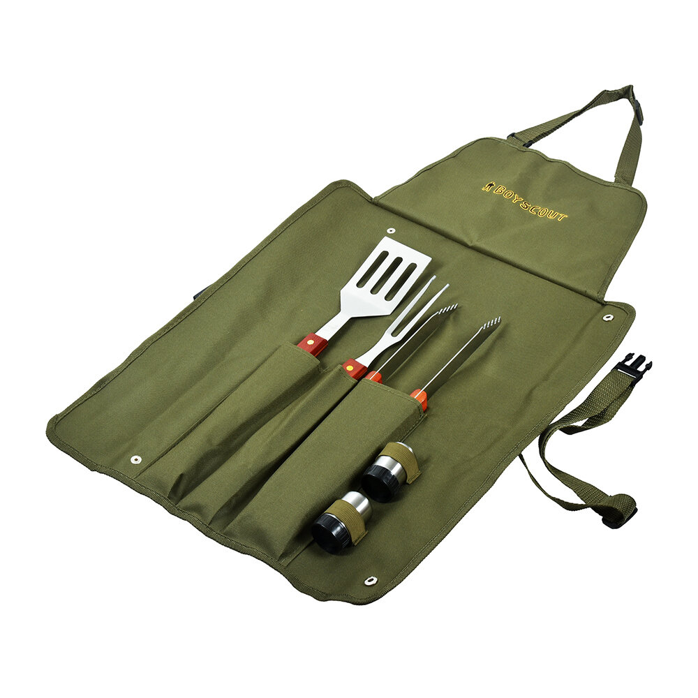 10 цен на Набор для барбекю (сумка-фартук, вилка, лопатка, щипцы, солонка, перечница) "Boyscout" 61320
