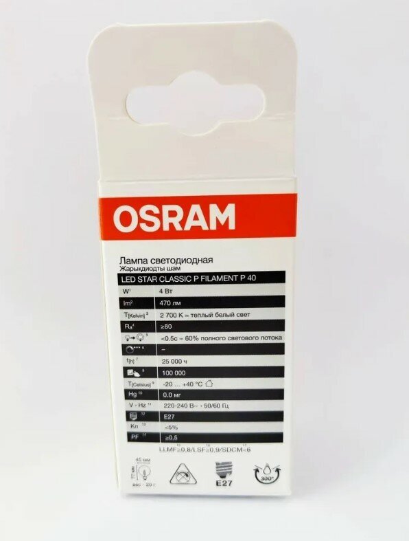 10шт/уп. Лампа LED Шарик 4Вт 220-240V E27 470Лм 2700К Угол 300 град. D-45mm L-77mm Филаментная Стекло Свет Теплый белый OSRAM, уп. 10шт информация: