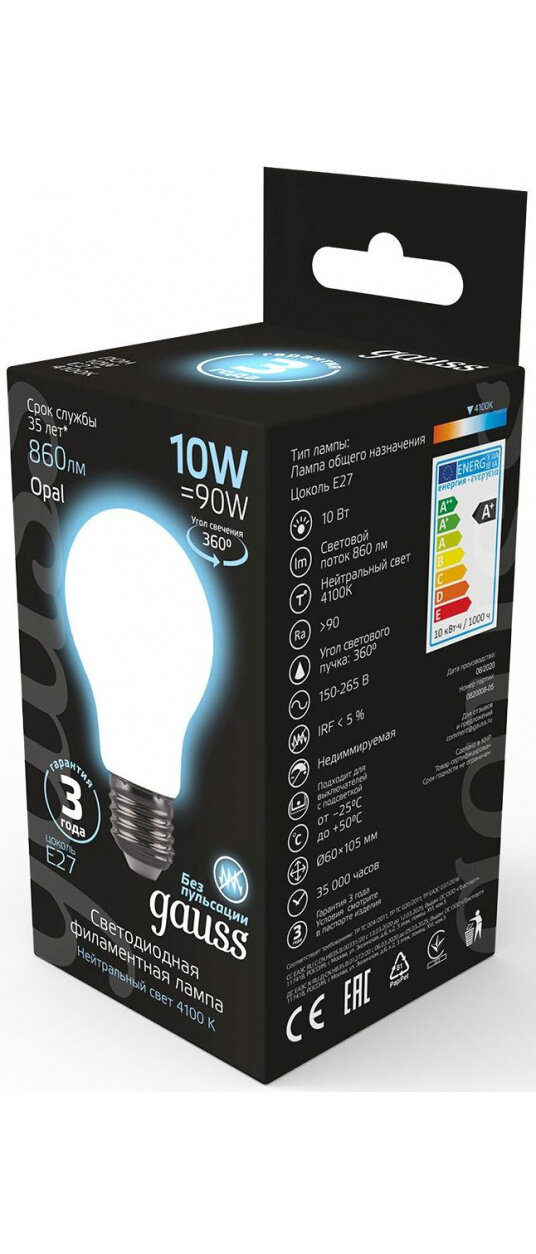 Лампа светодиодная филамент A60 10Вт E27 4100К холодная Filament A60-OPAL Gauss 102202210 1/10/40