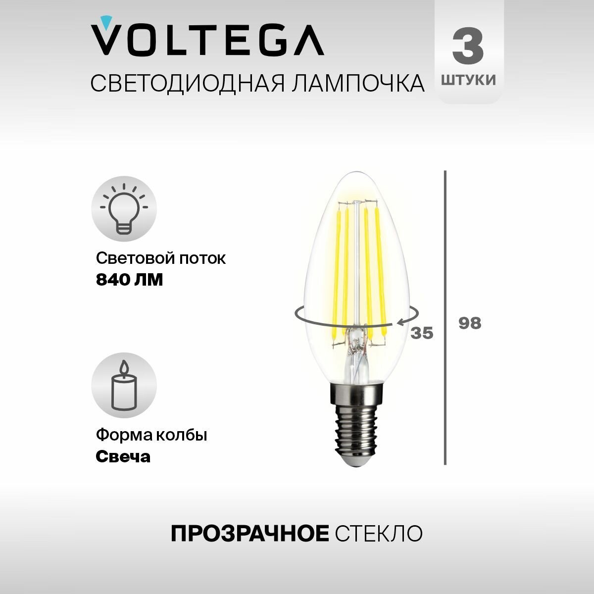 Отзывы на Лампочка светодиодная E14 форма свеча 9W теплый свет Voltega Crystal Graphene Candle 2800K упаковка 3 штуки