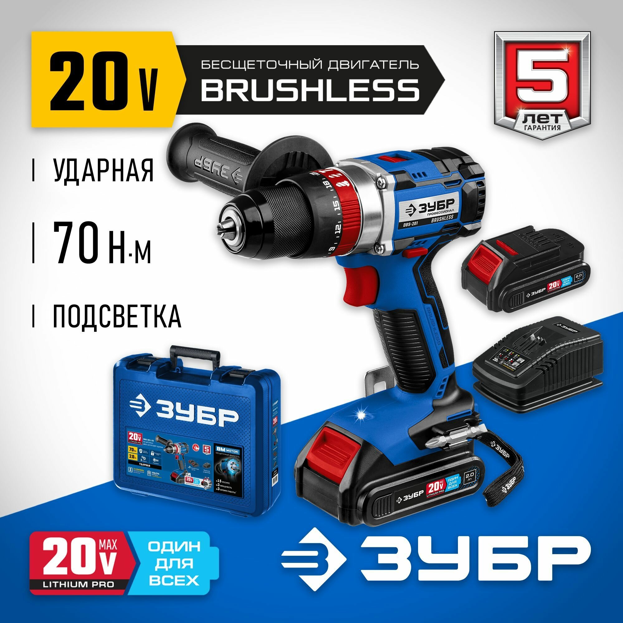 10 цен на Бесщеточная ударная дрель-шуруповерт ЗУБР Т7 DBS-201-22, 20 В, 70 Нм, 2 АКБ (2 Ач), кейс, Профессионал