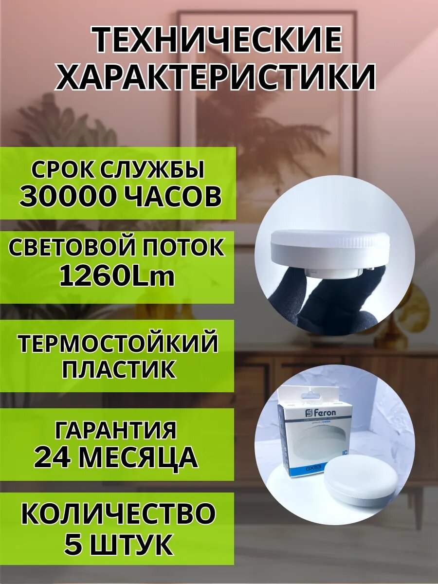 Лампа светодиодная FERON LB-454, GX53, 15W, 6400K, дневной белый свет, 5 шт информация: